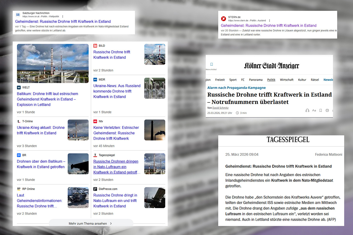 „Russische Drohnen dringen in Nato-Luftraum ein, Kraftwerk in Estland getroffen“, lautete gestern eine Schlagzeile des Tagesspiegels. „Russische Drohne trifft Kraftwerk in Estland“, verkündete die Bild-Zeitung ihren Lesern. Geheimdienst: Russische Drohne trifft Kraftwerk in Estland“, ist im Stern zu lesen. „Russische Drohne dringt in Nato Luftraum ein und trifft Kraftwerk in Estland“, heißt es von Die Presse. „Estnischer Geheimdienst: Russische Drohne trifft Kraftwerk“, titelt der „Nachrichtensender“ ntv. Laut Geheimdienstinformationen: Russische Drohne trifft Kraftwerk in Estland, heißt es auf RP Online.