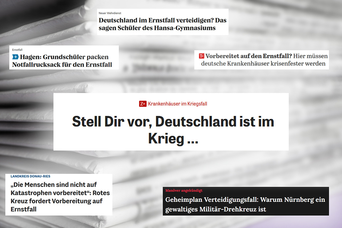 „Hagen: Grundschüler packen Notfallrucksack für den Ernstfall“, darüber berichtet die Westfalenpost. „Deutschland im Ernstfall verteidigen? Das sagen Schüler des Hansa-Gymnasiums“, so die Überschrift eines Artikels in der Bergedorfer Zeitung. Öffentlicher Dienst im Spannungs- und Verteidigungsfall: dbb fordert klare Regeln, starke Strukturen und Schutz der Beschäftigten, lautet eine Stellungnahme von Beamtenbund und Tarifunion. „Die Menschen sind nicht auf Katastrophen vorbereitet“: Rotes Kreuz fordert Vorbereitung auf Ernstfall“, ist in der Donauwörther Zeitung zu lesen. Krankenhäuser im Kriegsfall: Stell Dir vor, Deutschland ist im Krieg, darüber schreibt DIE ZEIT.
