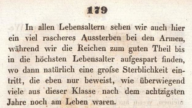 Es geht in diesem vierten und letzten Teil um die Gesundheit der Älteren und das Renteneintrittsalter. Das Renteneintrittsalter soll mit der gestiegenen Lebenserwartung verknüpft werden, also steigen. Nun ist die Lebenserwartung, oder etwas präziser die ‚wahrscheinliche Lebensdauer‘, eben nicht die gleiche unter allen Lebensbedingungen. Das war allerdings schon vor rund 200 Jahren relativ gut bekannt. Schauen wir auf ein Fazit aus einem Buch des Jahres 1835.