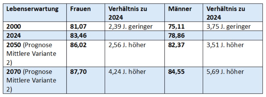 [«9] Daten zur Lebenserwartung 2000, 2024, 2050 und 2070 (für 2050 und 2070: Mittlere Variante). Quelle: Destatis – Statistisches Bundesamt: Bevölkerungsvorausberechnung 16. koordinierte Bevölkerungsvorausberechnung, Annahmen und Ergebnisse – Lebenserwartung, Grafik 10, Mittlere Variante L2, hier