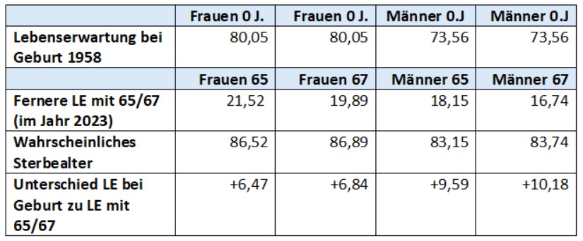 Männer, die 1958 geboren wurden, hatten eine Lebenserwartung von 73,6 Jahren. Im Jahr 2023 mit 65 Jahren betrug die fernere Lebenserwartung noch 18 Jahre, also das wahrscheinliche Sterbealter war bereits auf 83,2 gestiegen und damit 9,6 Jahre höher als bei der Geburt. Frauen hatten eine erheblich höhere Lebenserwartung, im Geburtsjahr 1958 waren dies 80 Jahre. Die ‚Fernere Lebenserwartung’ mit 65 beträgt rund 21,5 Jahre, das geschätzte Sterbealter somit 86,5 Jahre. Der Unterschied zwischen Lebenserwartung bei Geburt und mit 65 beträgt betragt somit etwa 6,5 Jahre (von 80,05 auf 86,52).