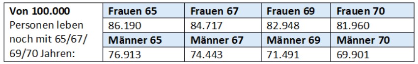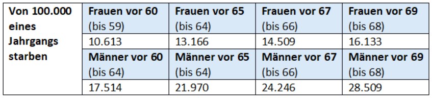 Umgekehrt heißt das auch: das Renteneintrittsalter von 65 erreichen 14 Prozent der Frauen und 24 Prozent der Männer nicht. Das Renteneintrittsalter 67 Jahre erreichen 15 Prozent der Frauen und mehr als 25 Prozent der Männer nicht. Mit 69 wären bereits 17 Prozent der Frauen und rund 28,5 Prozent der Männer gestorben. Wäre das Renteneintrittsalter 70, wären bereits 18 Prozent der Frauen und rund 30 Prozent der Männer gestorben.[17]