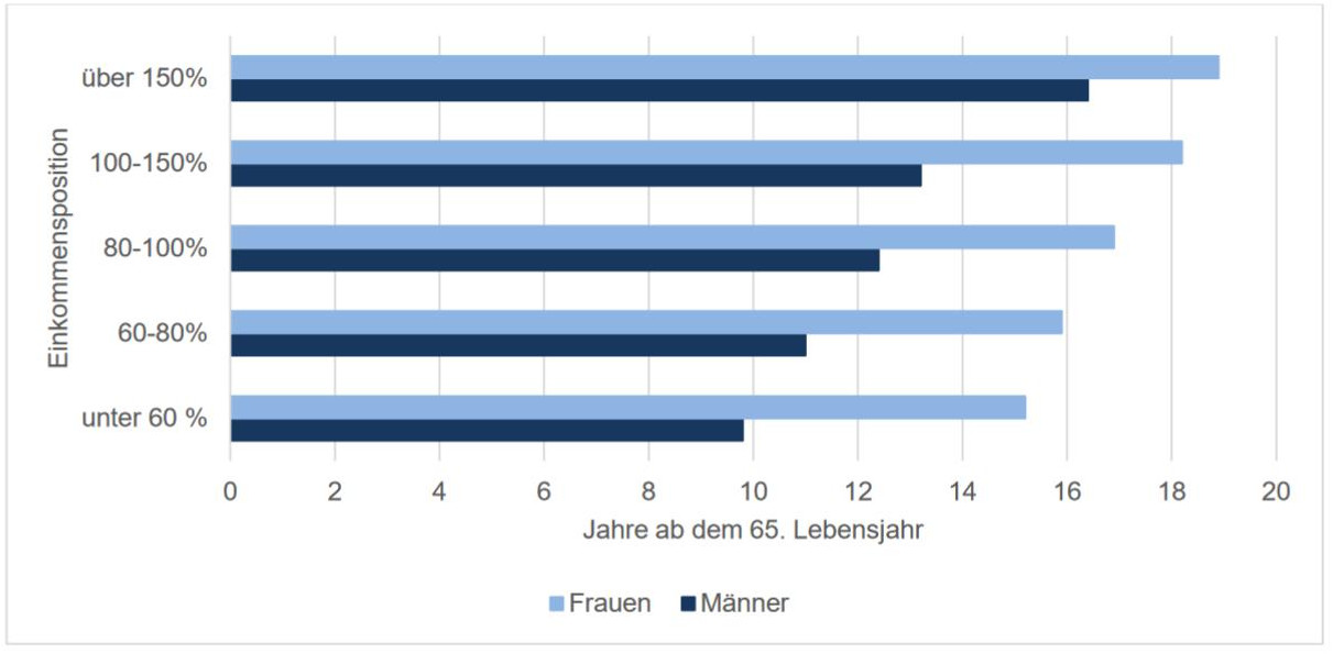 „Bei Frauen beträgt die Spannweite zwischen der niedrigsten und höchsten Einkommensgruppe 3,7 Jahre, bei Männern 6,6 Jahre. Die Ergebnisse der Trendanalysen sprechen dafür, dass die sozialen Unterschiede in der Lebenserwartung über die letzten 25 Jahre relativ stabil geblieben sind.“[24]