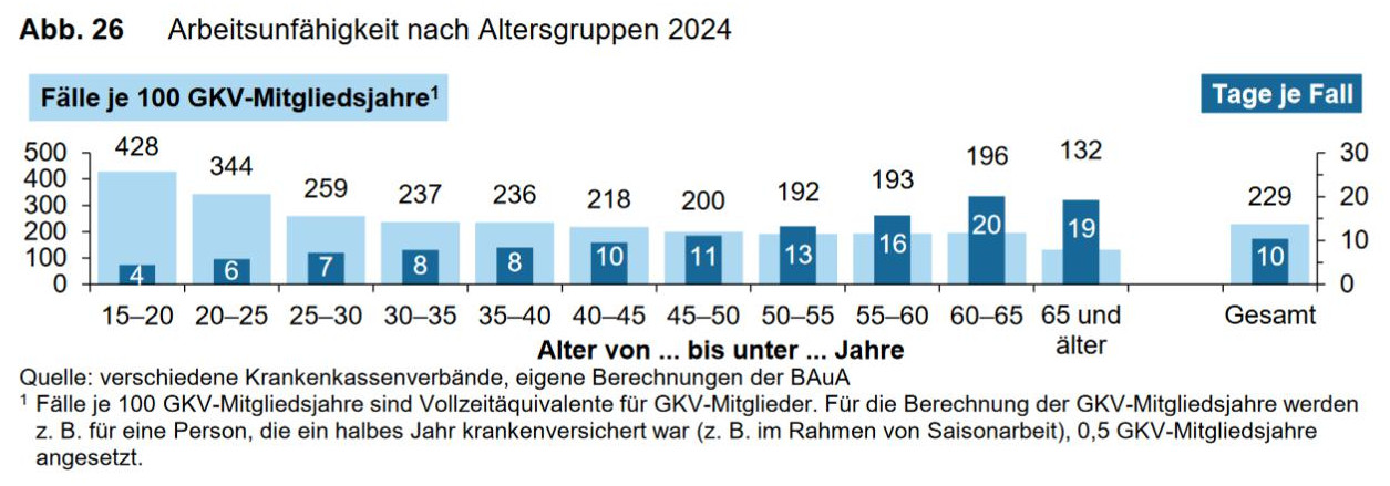 Die Statistik der Krankheitstage zeigt ein ähnliches Bild. Nimmt man als Basis 100 Versicherte zwischen 60 und 65, so sind diese pro Jahr 196-mal krank (also jeder ca. zweimal), die Krankheitsdauer pro Fall beträgt 20 Tage.