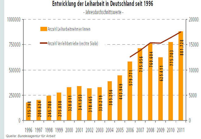 Auch zum Vergleichsjahr 1991 hat sich die Anzahl der Leiharbeitsjobs deutlich erhöht. Außerdem hat sich der Anteil der zeitlich befristeten Arbeitsverträge gegenüber dem Jahre 1991 erheblich ausgeweitet.
