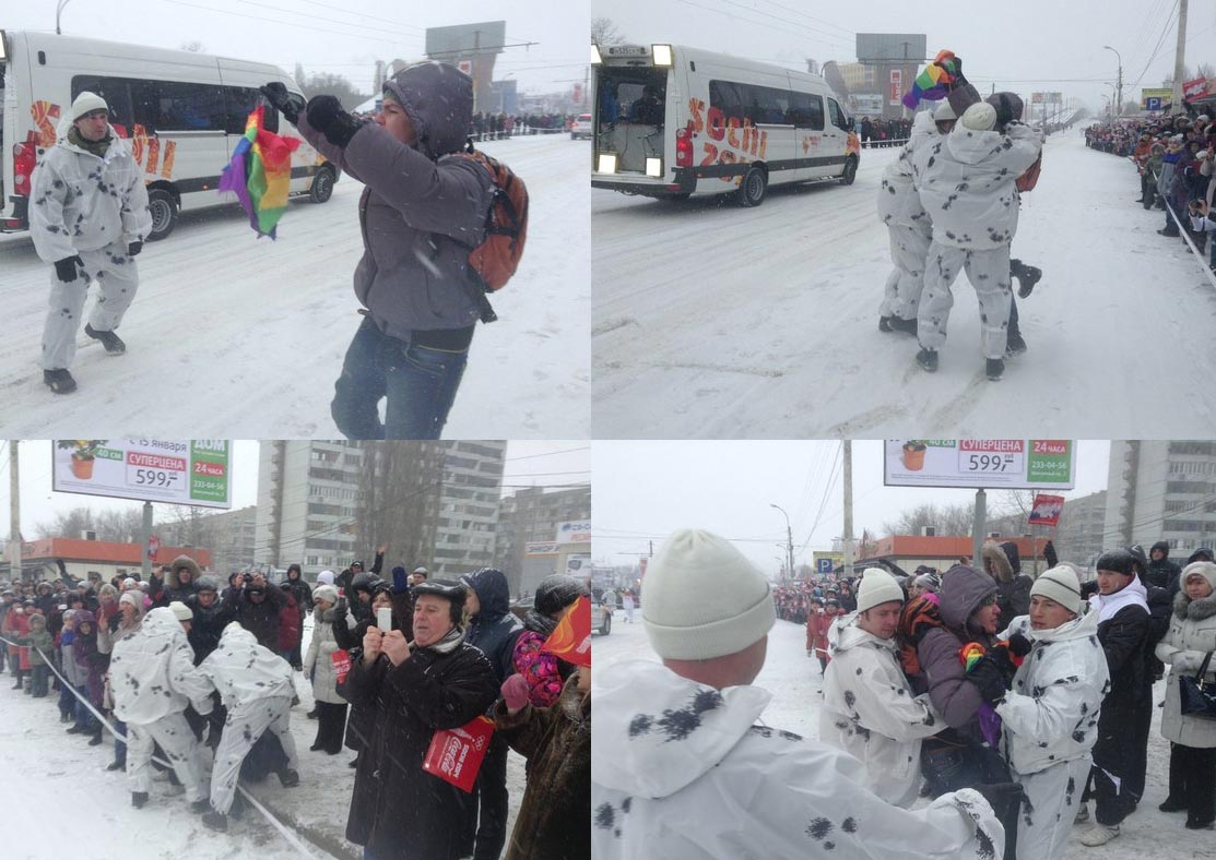 Laut dem Hamburger Abendblatt wurde am Samstag in Woronesch ein „schwuler Aktivist am Rande des olympischen Fackellaufs festgenommen […] weil er eine Regenbogenfahne zeigte“. Auch Zeit.de sieht dies so – dort heißt es, „er wurde festgenommen, weil er gegen Homophobie protestierte“. Ähnlich auch die Interpretation von SPIEGEL Online. Alle drei Artikel sind mit einem Photo von Andrej Nasonow bebildert, auf dem zu sehen ist, wie ein Sicherheitsmann einen Demonstranten mit Regenbogenfahne am Rande des Fackellaufs in der Nähe der Absperrung in den Schwitzkasten nimmt. So muss natürlich der Eindruck entstehen, als haben die Sicherheitskräfte sich einen Demonstranten aus dem Publikum am Rande der Strecke herausgepickt, um ihm die Fahne abzunehmen.