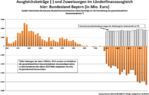 [«11] Quellen: Statistisches Bundesamt; Zusammenstellung Andreas Schuster, Referent DIE LINKE im Thüringer Landtag. Die Umsatzsteuermehreinnahmen Bayerns berechnet anhand 13% (Anteil der Bayern an den Deutschen) von 7% der Gesamtumsatzsteuereinnahmen.