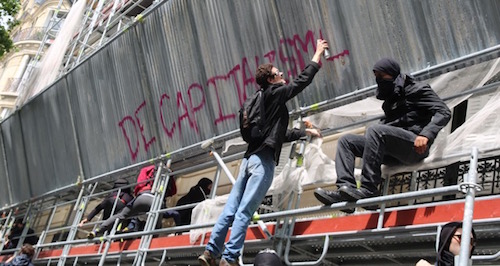 Die Welle der internationalen Solidarität ist enorm. Vor allem die Deutschen solidarisieren sich mit den französischen Aktivisten. Deshalb waren auch sehr viele Deutsche am 14. Juni in Paris. Leider haben sie jedoch auch Negativschlagzeilen gemacht. Es waren wohl deutsche Gruppen, die wahrscheinlich für die teilweise sinnlose Gewalt verantwortlich zeichnen. Auch die französischen Autonomen haben viel kaputt gemacht und beschmiert. So wurden die Scheiben von Werbetafeln entfernt und die Werbung dann durch Kunstplakate ersetzt. Einige Werbetafeln wurden auch mit Graffiti bemalt und beschrieben. Diese wurden dann aber oft auch von einigen „Casseurs“ (Randalierern) kaputtgeschlagen. Unter diesen Randalierern scheint es viele Deutsche gegeben zu haben. Man konnte deutsche Gruppen in ruhigeren Phasen dabei beobachten, wie sie sich darüber abgesprochen haben, wie sie sich besser wehren könnten. Oft waren diese Casseurs aber auch Polizisten in zivil. Diese wurden von einigen Fotografen dabei erwischt.