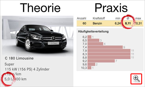 Konkret greifbar machen lässt sich die Problematik über Stichproben. Nehmen wir doch einmal den aktuellen 1,8-Liter-Benziner der Mercedes-Benz C-Klasse. Dieser wird vom Hersteller mit einem durchschnittlichen Kraftstoffverbrauch von 5,0 Litern auf 100 Kilometer beworben. Auf der Straße wird dieser Wert jedoch noch nicht einmal im Ansatz eingehalten. Bei den Werten des Vergleichsportals Spritmonitor.de fangen die Verbrauchswerte vielmehr erst bei 6,2 Liter an und betragen im Schnitt 8,1 Liter auf 100 Kilometer. Dies ist eine Abweichung von 61%! Stellen Sie sich doch einmal vor, eine Brauerei würde ihre 0,33-Liter-Bierflaschen nur noch mit 0,22 Liter Bier befüllen. BILD und CSU wären sicher empört. Bei Autos des Premium-Herstellers Mercedes-Benz ist derlei Etiketten-Schwindel offenbar geduldet.
