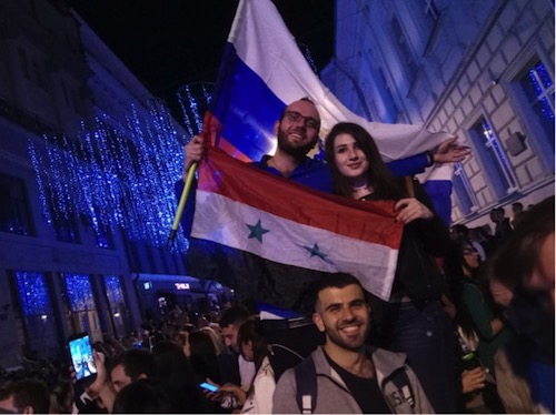 Auch die Straße füllt sich, es wird gesungen und getanzt. So ausgelassen habe ich Moskau noch nie erlebt. Wir gehen auf die Straße, lassen uns vom Treiben mitreißen. Überall Landesflaggen. Eine zieht in besonderer Weise meine Aufmerksamkeit auf sich. Es ist die syrische Flagge. Ich frage die junge Frau, die die Flagge hält, ob sie aus Syrien sei. Sie bejaht. Woher ich sei, will sie wissen. Aus Deutschland. Ihr warmes Lächeln kühlt merklich ab. Wir haben uns durch unserer Positionierung offenkundig nicht nur Freunde gemacht.
