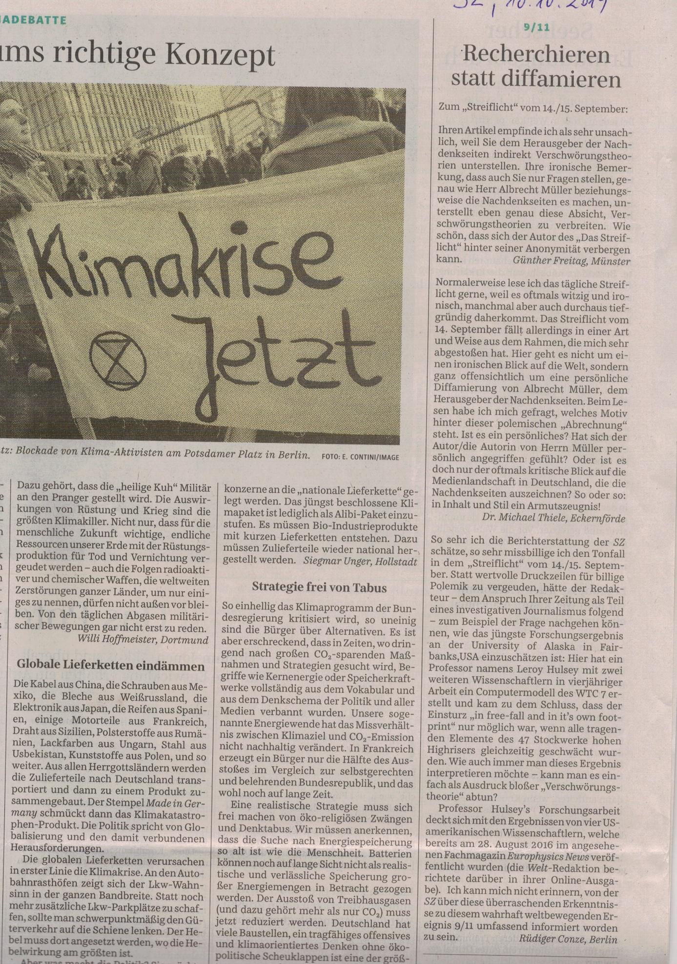 “Albrecht Müller macht in seinem neuen Buch das System der meist unsichtbaren, oft sehr leisen, aber sehr wirkungsvollen politisch-medialen Manipulationen, die uns tagtäglich erreichen, sichtbar.” - Drei Leserbriefe zum „Streiflicht“ der Süddeutschen Zeitung vom 14.9.2019, die die Süddeutsche Zeitung am 10.10.2019 veröffentlichte. Siehe rechte Spalte: