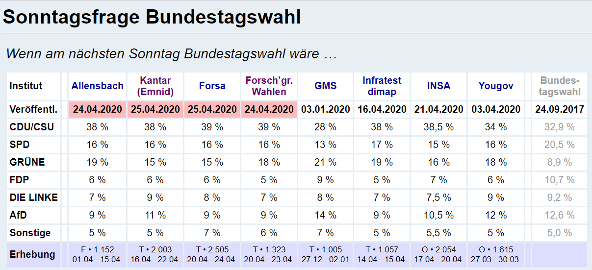Umfrageergebnisse sind mit Sorgfalt und Skepsis zu begegnen. Umfrageergebnisse können in heutigen Zeiten gesteuert werden. Aber eben nicht bei allen Instituten und nicht ganz. Außerdem verstärken Umfrageergebnisse nach aller Erfahrung die dort erkennbare Mehrheitsmeinung. Deshalb macht ein Blick auf die Ergebnisse der Sonntagsfrage Sinn. Hier ist die aktuelle Übersicht: