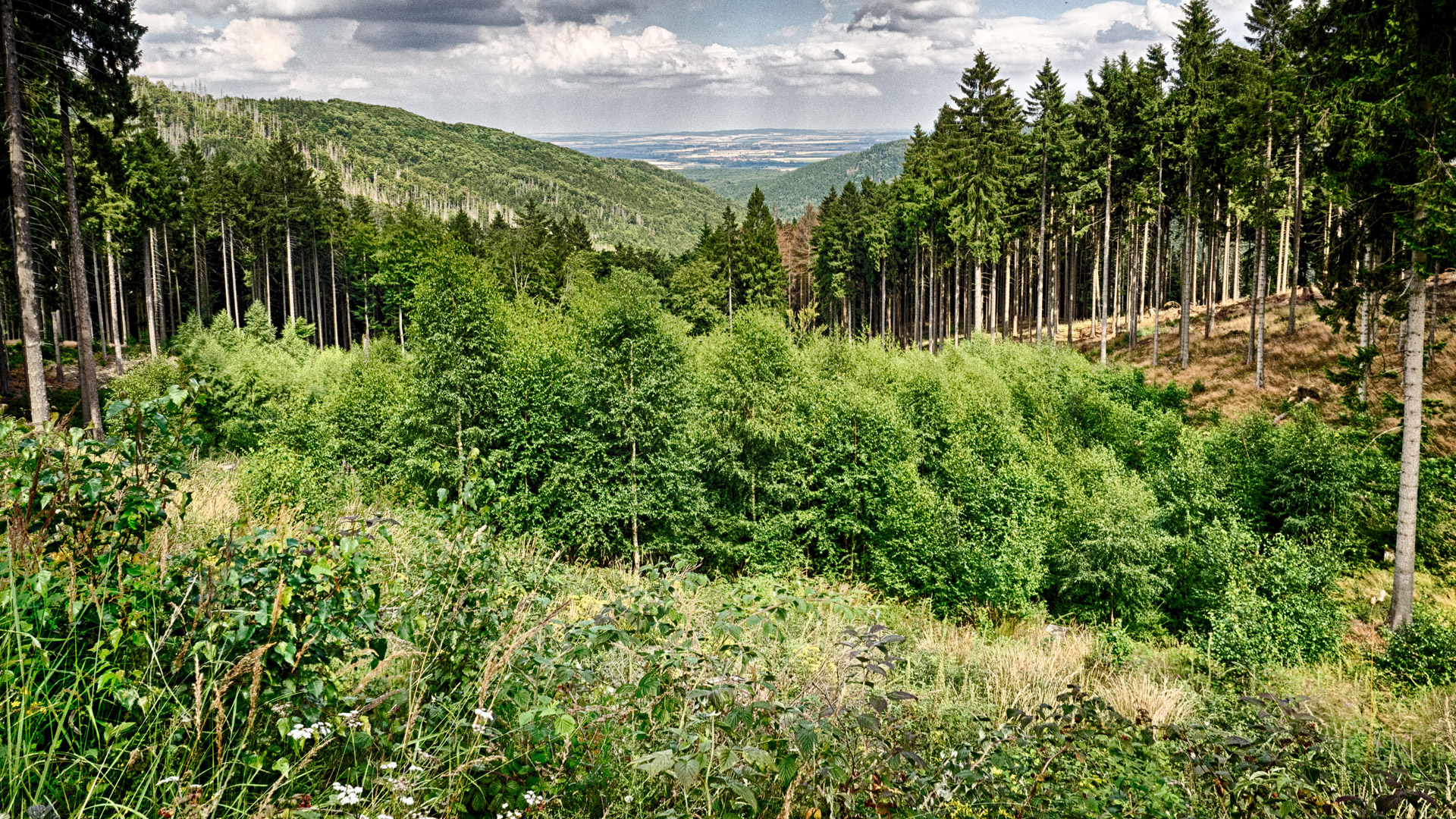Der Harz ist ein tragisches Beispiel für diese Geschehnisse. Im Januar 2018 war es der Orkan Friederike, der binnen weniger Stunden flächendeckend ganze Fichtenwälder umknicken ließ. In exponierten Lagen vernichtete der Orkan so viele Bäume wie der reguläre Einschlag sonst in zwei Jahren. Was folgte war der Dürresommer und der Borkenkäfer. Das Katastrophenjahr 2018 endete mit einem schneearmen Winter und das Folgejahr brachte nicht nur eine erneute Dürre, sondern auch den heißesten Sommer seit Beginn der Messungen, der abermals von einem schneearmen Winter gefolgt wurde. So hatte es der vergleichsweise schwache Orkan Sabine im Februar 2020 leicht, dem bereits massiv geschädigten Wald abermals schweren Schaden zuzufügen. Wer heute durch den Harz wandert, fühlt sich stellenweise eher an Mad Max als an die Märchenverfilmungen erinnert, die unser „Idealbild“ vom deutschen Wald noch immer prägen.