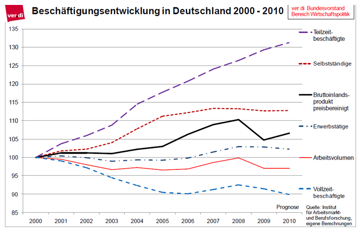 Die massive Inanspruchnahme von Kurzarbeit sowie der Abbau von Über-stunden und von Guthaben auf Arbeitszeitkonten haben einen starken An-stieg der Arbeitslosigkeit in der Krise verhindert.Von 2000 bis 2010 sind fast zweieinhalb Millionen bzw. zehn Prozent aller Vollzeitarbeitsplätze verloren gegangen.