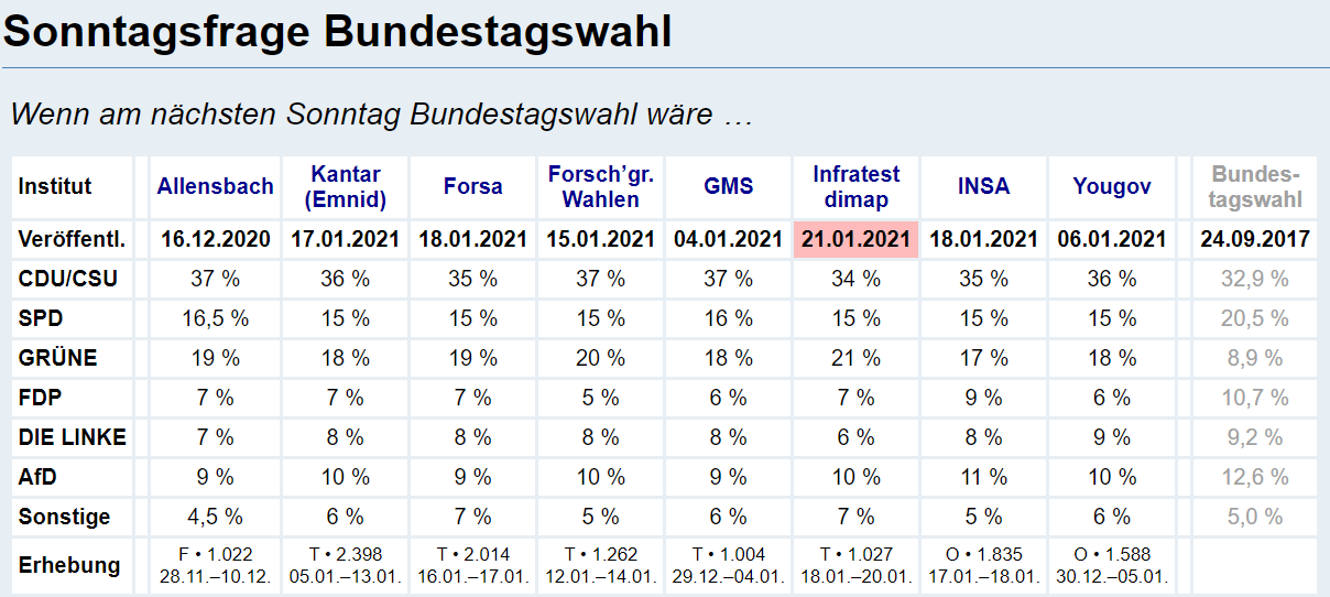 - Bei allen Instituten wird die Union aus CDU/CSU besser gehandelt als bei der letzten Wahl am 24.9.2017. Damals erhielt die Union 32,9 %. Das kleinste Umfrageergebnis liegt jetzt bei 34 %.