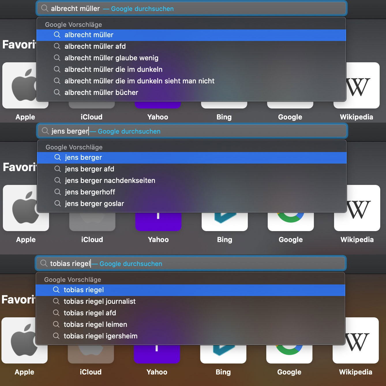 Unerklärliches spielt sich derzeit auch bei der automatischen Vervollständigung der Suchbegriffe bei Google ab. Geben Sie mal in die Adresszeile ihres Browsers oder das Suchfeld von Google die Namen „Albrecht Müller“, „Jens Berger“ oder „Tobias Riegel” ein. Wie durch Geisterhand präsentiert ihnen Google einen Suchvorschlag, der unsere Namen mit dem Zusatz „AfD“ ergänzt. Das ist insofern erstaunlich, da bekanntlich weder Albrecht Müller noch Tobias Riegel oder ich irgendetwas mit der AfD zu tun und – wenn überhaupt – nur kritisch über diese Partei geschrieben haben. Wie kommt Google auf diese absurde „Vervollständigung“? Auch hierfür gibt es keine rationale Erklärung. Überflüssig zu erwähnen, dass diese Vervollständigung boshaft und ehrenrührig ist. Wer uns nicht kennt und nach uns googlen will, muss zunächst denken, wir seien irgendwie mit der AfD verbandelt. Ein weiteres Opfer dieses rufschädigenden Missbrauchs ist der Handelsblatt-Journalist Norbert Häring, der dazu auch einen sehr lesenswerten Beitrag geschrieben hat.
