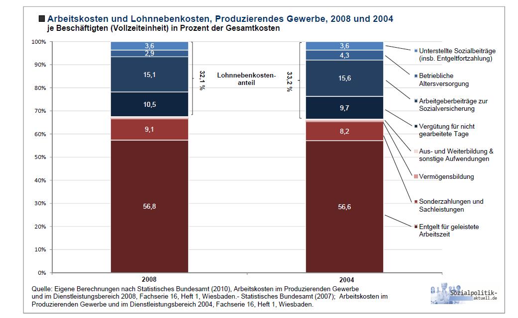 Die Ende 2010 vom Statistischen Bundesamt veröffentlichten Daten über die Arbeitskosten und Lohnnebenkosten im Jahr 2008 lassen (hier für das produzierende Gewerbe) erkennen, dass- der Anteil der Lohnnebenkosten an den gesamten Arbeitskosten seit 2004 nicht gestiegen, sondern von 33,2% auf 32,1% gesunken ist,