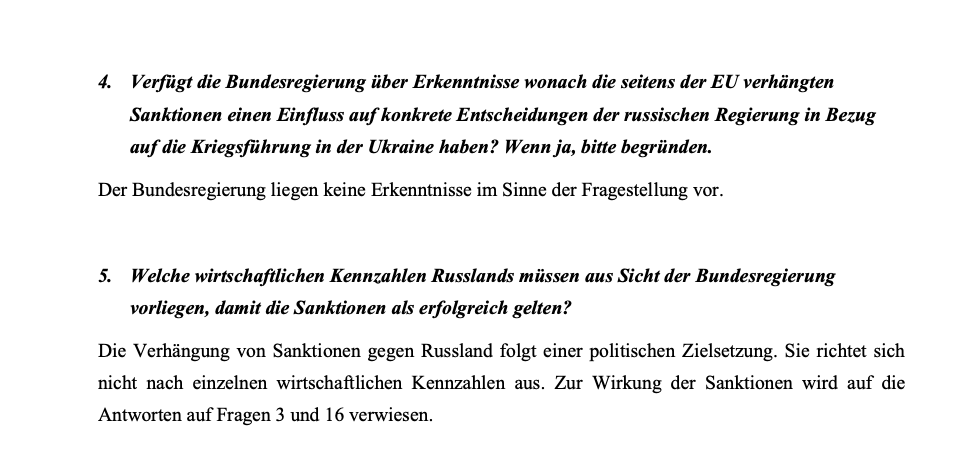Weiter führt die Bundesregierung jedoch aus, dass die Sanktionen angeblich „einen Beitrag leisten, Russland zur Beendigung seines Angriffskriegs zu bewegen.“ Allerdings zeigt sich die Bundesregierung in den gesamten Antworten auf die Kleine Anfrage nicht in der Lage oder willens, diese Behauptung mit Fakten und Zahlen zu untermauern.