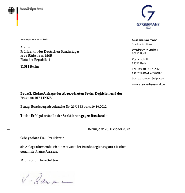 „Die gegen Russland verhängten Sanktionen sind in ihrer Art und Ausgestaltung präzedenzlos. Sie sind ein wichtiges Element der Politik der Bundesregierung und ihrer internationalen Partner, die darauf abzielt, die territoriale Integrität der Ukraine zu schützen und Russland zur Beendigung seines brutalen, völkerrechtswidrigen Angriffskriegs gegen die Ukraine zu bewegen. Weitere zentrale Elemente sind die militärische, humanitäre und finanzielle Unterstützung der Ukraine. Diese Elemente wirken im Verbund und tragen gemeinsam zur Erreichung der Ziele der Bundesregierung und ihrer Partner bei.“