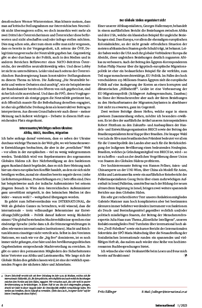 Hiermit möchten wir den NachDenkSeiten-Lesern wieder einmal die von Fritz Edlinger herausgegebene österreichische Zeitschrift vorstellen. Sie finden hier das Cover der Ausgabe I/2023, das Inhaltsverzeichnis, das Editorial des Herausgebers Edlinger auf Seite 3 und Seite 4, einen Beitrag über Brasilien und die Rückseite der Zeitschrift. Thema des aktuellen Heftes ist Neutralität. Dieses Thema wird kontrovers behandelt. Diese Vorstellung dieser neuen Ausgabe von „International“ ist verbunden mit der Empfehlung wohlwollend zu prüfen, ob dieses gedruckte Medium Ihre Unterstützung findet. Albrecht Müller.