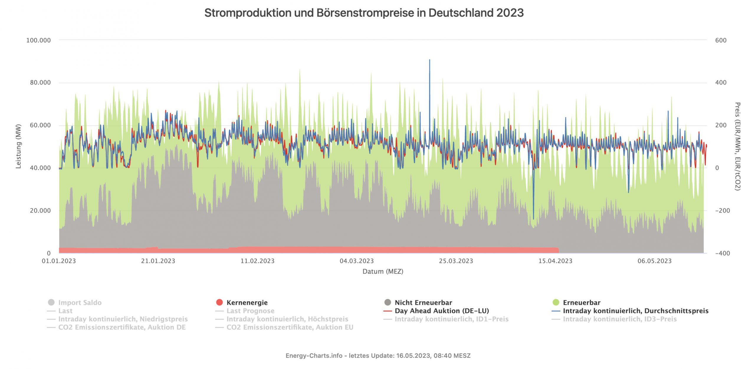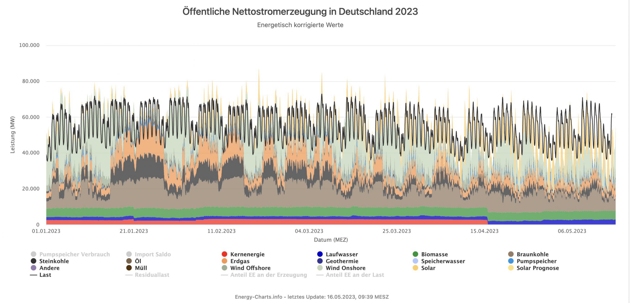 Interessanter ist da schon die Debatte, wie der endgültige Ausstieg aus der Kernkraft sich auf die Versorgungssicherheit auswirkt. Auch hier melden Grünen-Kreise gespielt euphorisch, dass die AKW-Abschaltungen keine negativen Auswirkungen gezeigt hätten. Kunststück, wie sollten sie? Traditionell sind April und Mai nicht dafür bekannt, besonders windarm und dunkel zu sein, und die große Heizsaison, in der besonders viel Strom in Wärmepumpen und klassische Elektroheizungen geht, ist auch vorbei. Wie man anhand der Statistiken sieht, spielt der Wegfall der ohnehin kaum mehr bedeutenden Kernkraft da keine Rolle.